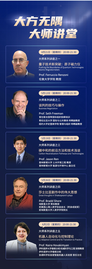 为开拓我校学生国际学术视野,增加与世界学术大师近距离接触的机会,满足学生学习多样性需求,提升多角度思考问题的能力,进一步加强学科交叉和跨学科人才培养,“让理工科的学生增加人文情怀,让人文社科的学生增强科学素养”,提高解决问题的学术能力,进行面向国际、面向未来、面向全人类的国际化思维训练。教务处在本学期将陆续推出《大方无隅·大师讲堂》系列大师讲座,来自全球一流高等学府和研究机构的专家教授将做客讲堂,与同学们分享科学人文前沿的研究方法、进展以及前沿交叉学科领域的新发展动向。