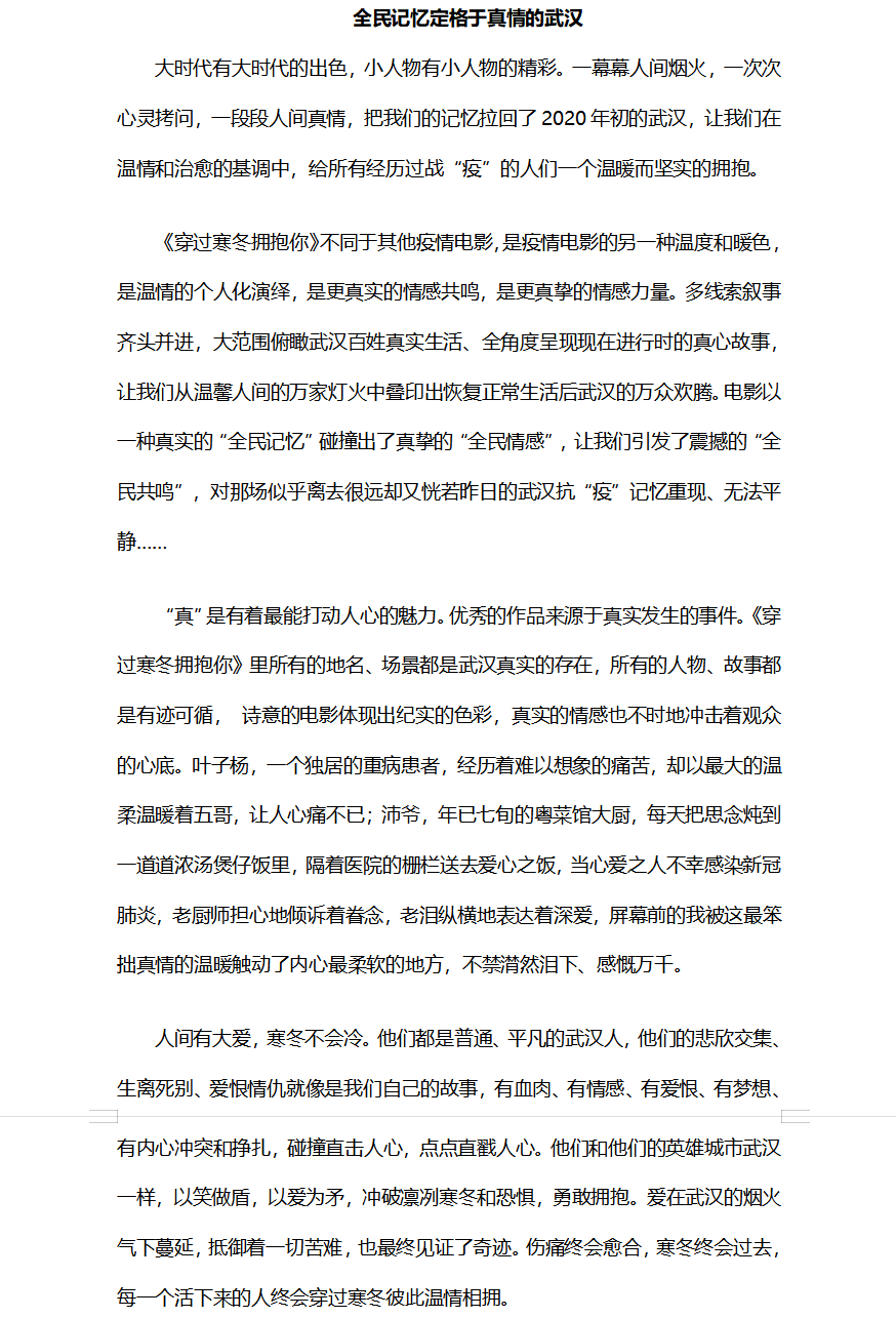 这部电影聚焦于2020年1月23日武汉宣布封城后的特殊时期,以温暖和治愈为主基调,刻画了普通市民守望相助、真挚动人的爱情群像。快递员阿勇、骑手武哥、钢琴老师叶子扬、中年夫妇刘亚兰和李宏宇、退休老医生谢咏琴和餐厅老板沛爷等等人物的故事,展现了疫情下爱给予他们的挺身而出的勇气和力量。他们以笑做盾,以爱为矛,冲破凛冽寒冬和恐惧,勇敢拥抱。同学们深切地感受到了爱在武汉的烟火气下蔓延,爱能够抵御一切苦难,最终创造奇迹。