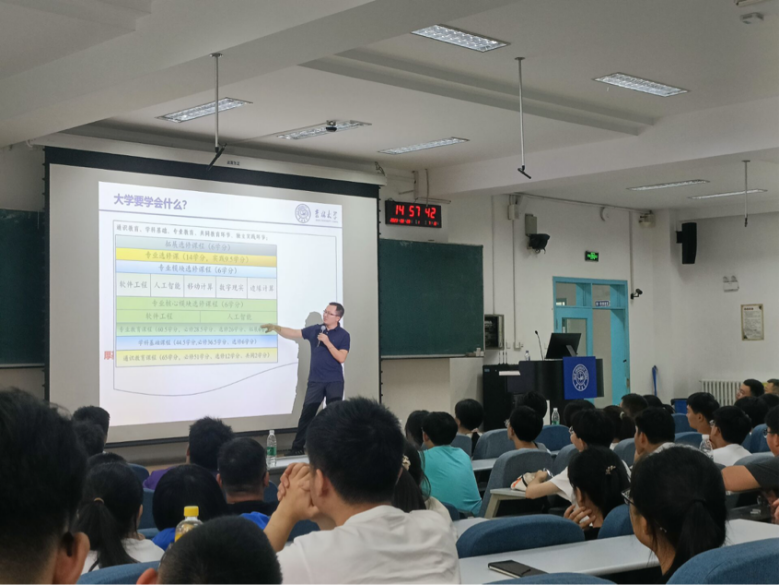 副院长周柚教授担任主讲人,软件工程专业负责人吕帅老师、数据科学与大数据技术专业负责人时小虎老师和全体2023级本科新生参加了本次讲座。