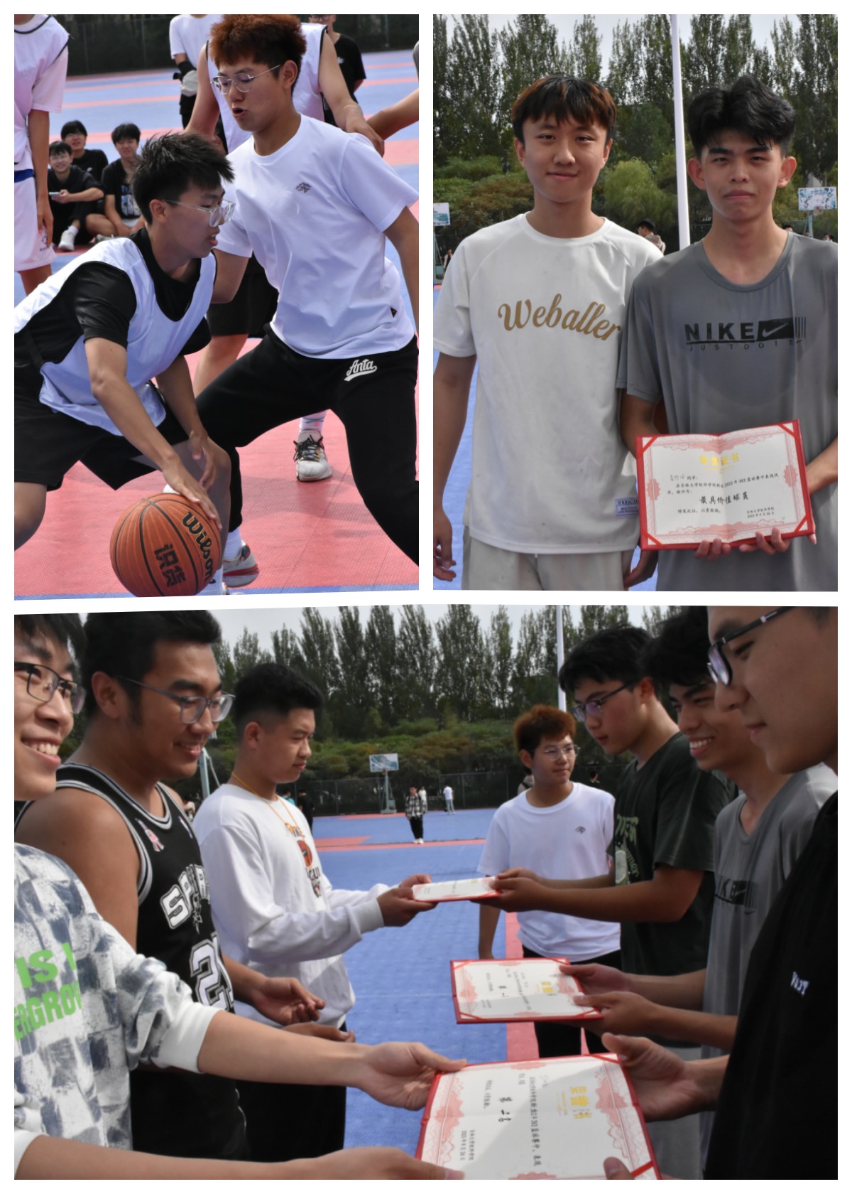 团委副书记、学生会主席、篮球队队长分别为获得前三名的队伍颁奖并合影留念。