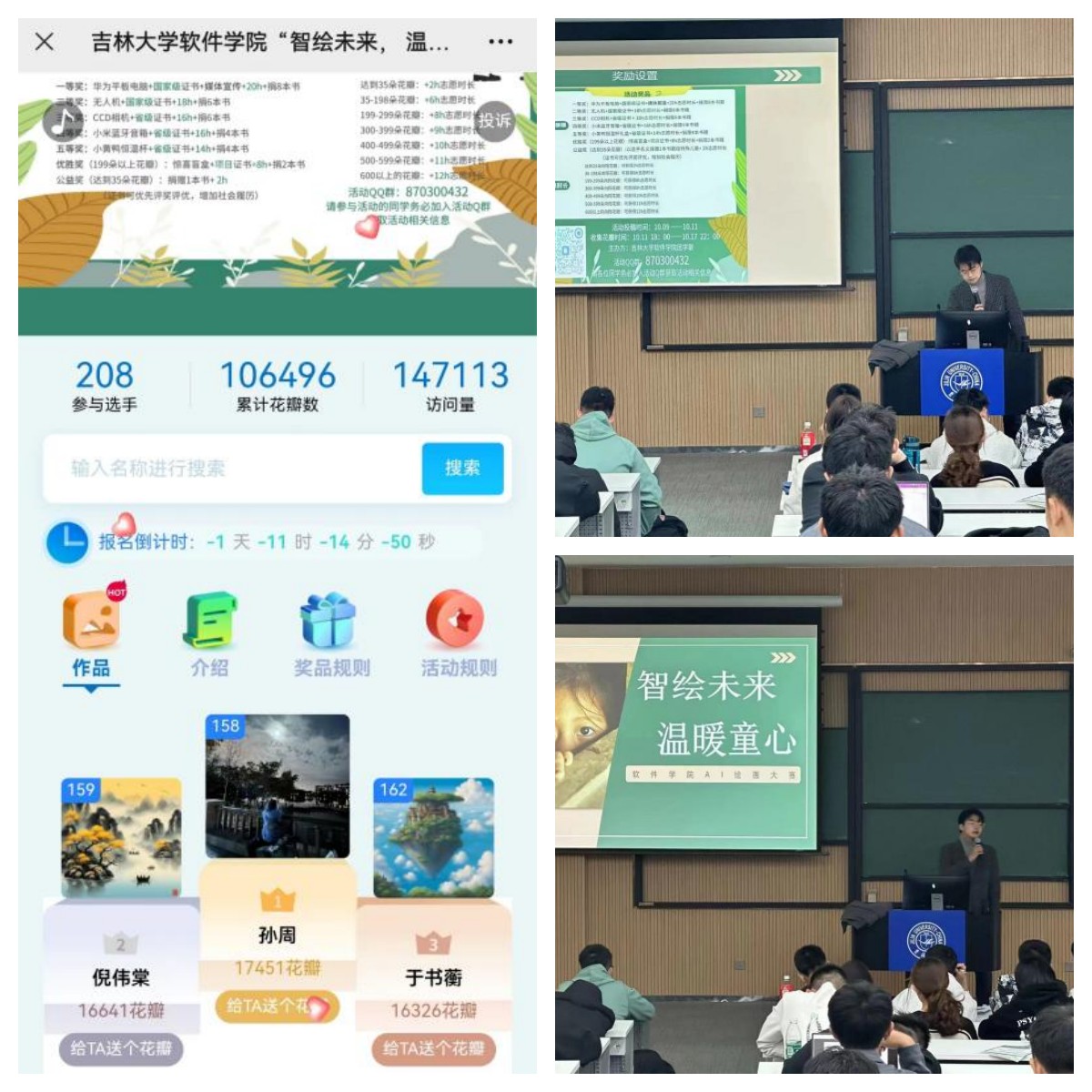 共有208名同学参与了AI绘画作品的投稿。根据最终的“花瓣”数统计结果,孙周、倪伟棠两位同学分别收到17451个“花瓣”和16641个“花瓣”,荣获国家级证书;于书蘅、顾峻诚、来梁东三位同学分别收到16326个、11611个和6720个 “花瓣”并获得省级证书;薛晴伊、周子航等32名同学获得了项目级证书。承载着爱心的“花瓣”将飘散到留守儿童的手中,为他们带来生活的温暖和希望,向他们传递积极向上的勇气和力量。