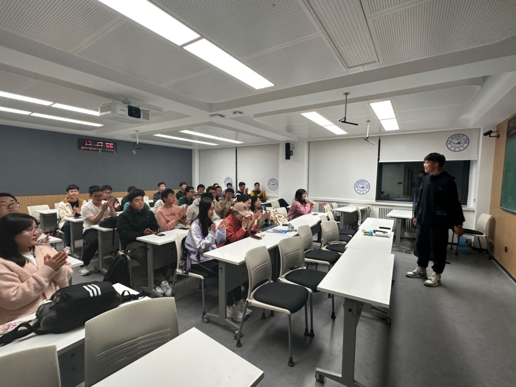 活动的第一个环节是“一分钟鼓掌”的热身游戏,同学们需要在游戏开始前对自己的鼓掌次数进行预测,并在实际游戏过程中记录鼓掌次数,通过对比预测和现实中的次数结果来分享游戏体会。大家从这个游戏中感悟到了设定合理预期目标和遵循职业生涯发展规划路线的重要性,懂得了只有结合具体条件明确自己在大学期间的目标并坚持执行,才会最终实现人生理想。随后,同学们随机分组,在依次进行简短的自我介绍后,正式开始了一系列趣味团体游戏。 在“信任之旅”的游戏中,同学们被分为两组,一组同学的双眼被蒙住来体验盲人的感觉,另一组同学作为领路人,在没有语言沟通的情况下带领第一组同学走到终点,培养了同学之间的信任感与合作精神。在“集体登陆”的游戏中,各小组的同学需要全部站到一张A4纸大小的范围内,大家集思广益,不断尝试,通过默契的配合顺利地完成了游戏的任务。在“人体字母”的游戏中,同学们利用自己的身体摆出不同的字母造型,合力完成了单词的拼写,展现出了强大的团队凝聚力。最后,大家拿起手中的画笔,以小组为单位,共同绘制出了团体树并写下了对于大学生活的美好期许,活动在一片欢声笑语中圆满结束。