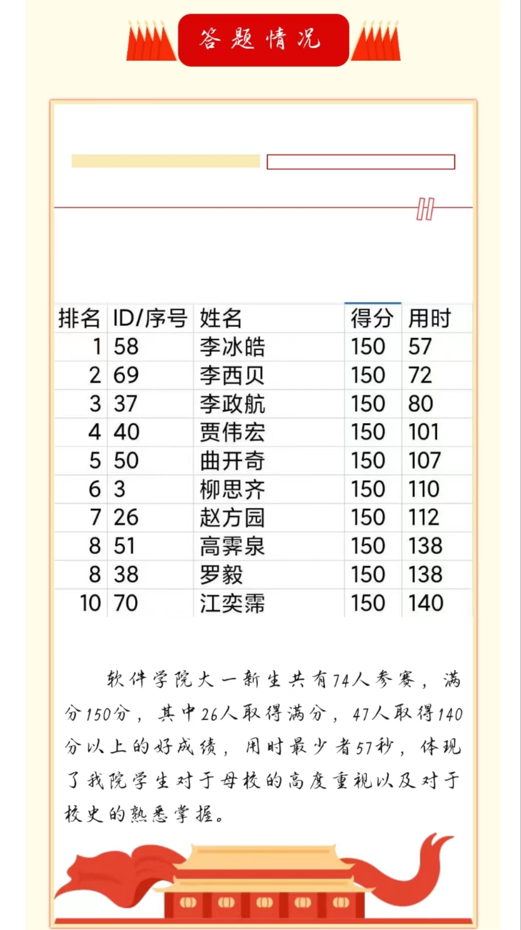 本次活动共吸引了74名同学报名参与,许多同学在赛前主动通过学校官网、公众号等多种渠道进行针对性学习,全面深入地了解了学校的发展历程和概况,为比赛做好了充足的准备。在比赛过程中,同学们反应迅速,精准作答,展现出对校史知识的熟练掌握和对母校的无限热爱。他们凭借对校史知识的深厚储备及出色的临场表现,赢得了现场观众的阵阵掌声。最终,共有26名同学取得了满分150分的好成绩,47名同学的得分超过了140分,答题最短用时仅57秒。赛后,许多同学表示,自己通过参与本次活动更真切地感受到学校深厚的文化底蕴和人文气息,增强了在91论坛