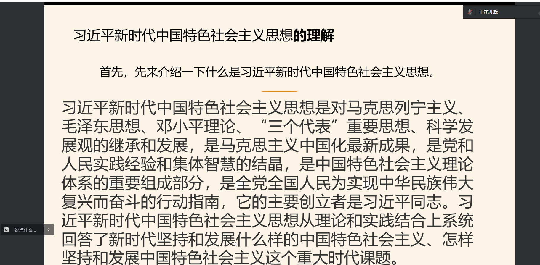 在本次活动的理论学习环节,团委实践部依托互联网平台,采用图文并茂的方式向同学们介绍了习近平新时代中国特色社会主义思想的主要内容及理论特色,使同学们更好地把握习近平新时代中国特色社会主义思想的科学体系、核心要义、实践要求。通过深入学习理论知识,同学们认识到习近平新时代中国特色社会主义思想是顺应时代发展要求、实践发展需要、人民群众愿望创立的,并且是在指导新时代波澜壮阔的创造性实践中不断丰富和发展的。在接下来的知识问答环节,团委实践部围绕上一环节的学习内容,从改革发展稳定、内政外交国防、治党治国治军等多个方面提出了一系列问题,以检验同学们对习近平新时代中国特色社会主义思想的理解及学习效果。同学们踊跃抢答,相互交流,共同探讨习近平新时代中国特色社会主义思想的精髓要义、思想脉络和内在逻辑,推动了理论学习不断往深里走、往实里走、往心里走。