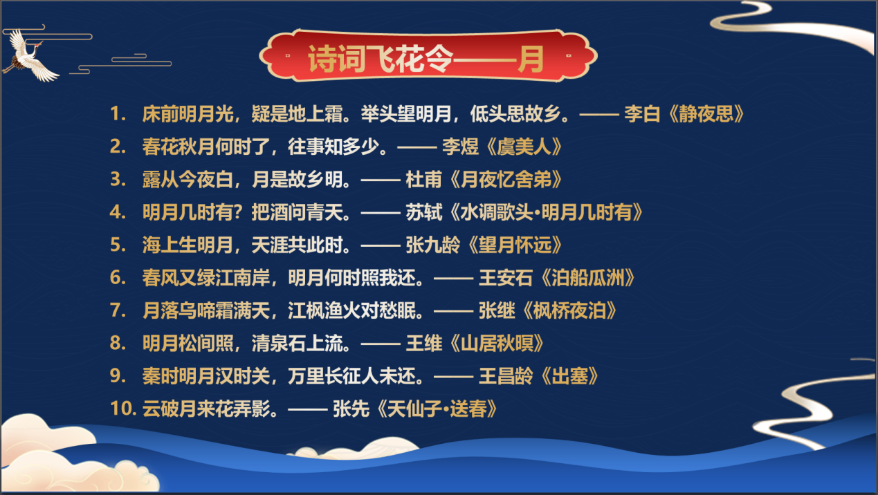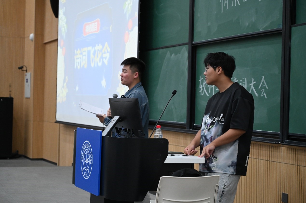 学生会宣传部在敬信教学楼F1阶梯教室举办了一场以“月满金秋·情系吉大”为主题的诗词大赛。此次活动吸引了众多同学积极参与,共同感受诗词与中秋的独特魅力。