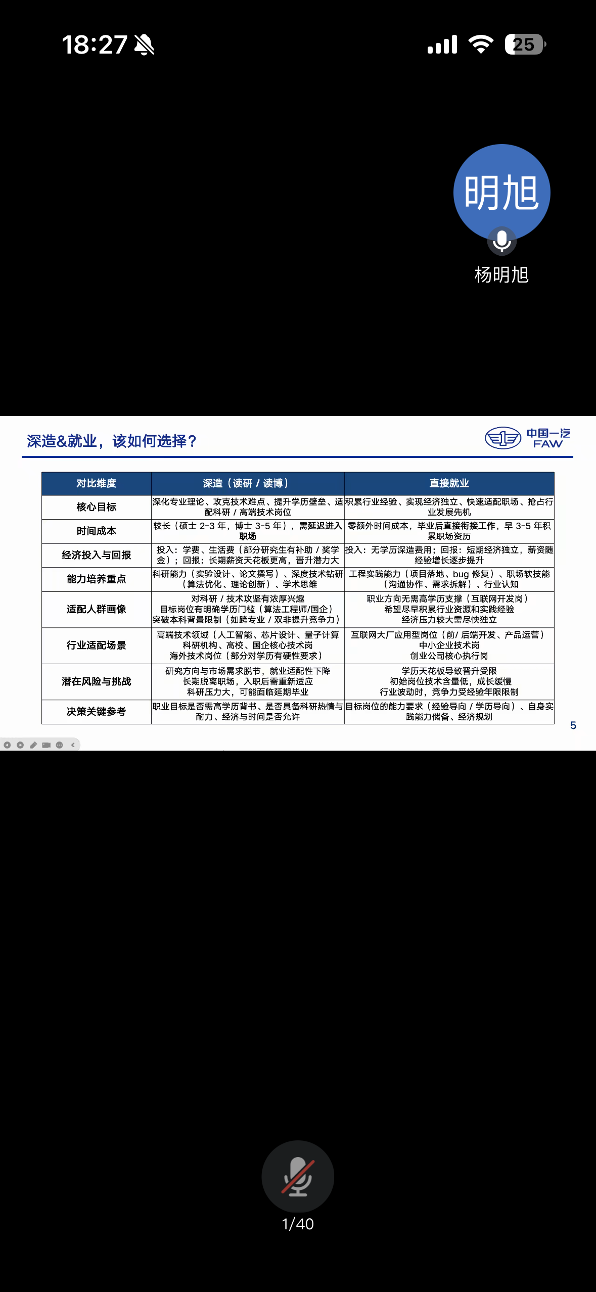 首先,郭子浩从个人情况、岗位区别、经验累积等方面展开阐述,明确指出学历深造与直接就业各有利弊,应结合个人实际情况量力而行,不要盲目跟风选择,针对不同岗位应明确职责和所需能力,结合自身能力有针对性开展准备,确保能力培养和技能提升与所选岗位相匹配。杨明旭主要介绍当前就业形势,并强调保持持续学习能力的重要性,提出必须通过不断更新知识应对技术迭代,在满足岗位需求的同时实现个人价值创造。作为本科期间便具有丰富实践经验的同学,杨明旭建议大家把握大二大三寒暑假的关键期,根据个人专业方向主动探寻实习机会,通过早期实践积累,既能为未来职业发展奠定基础,也可在升学求职过程中掌握主动权。而针对大学不同阶段的准备内容,二人形成清晰共识:大一大二应注重夯实专业基础,大三大四则需重点提升实践能力,通过知识与能力的结合,在就业竞争中构筑个人优势。