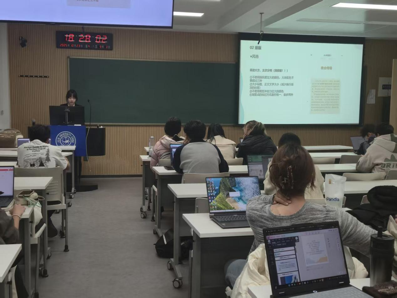 随后,闫芳菲聚焦推送编辑的细节要点。她针对排版风格、字体型号、模板套用等关键环节进行细致说明,进一步明确公众号推送的编辑标准与操作规范。为帮助大家深化理解,她还现场展示学院发布的优秀公众号推送案例,结合案例中的排版设计、图文搭配、互动元素插入等具体内容,深入浅出地讲解如何通过优化呈现形式,让推送达到简洁大方、重点突出、一目了然的效果。