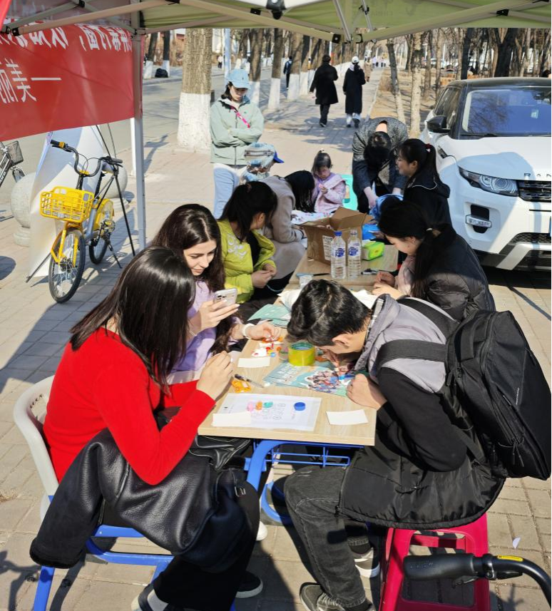 活动启动后,摊位上的手作物料迅速吸引了过往师生,志愿者们热情讲解活动流程与公益意义,细致解答疑问。很快,摊位周围便聚集了大量师生,大家满怀热忱投入创作,挥动画笔、编织彩绳、书写寄语,将对特殊儿童的关怀与祝愿倾注于手作之中。现场氛围温馨热烈,也吸引路过的留学生驻足参与,亲手制作明信片传递爱心,诠释“爱心无国界”;也有踏春的小朋友用童真笔触创作作品,为山区特殊儿童送去纯粹祝福,成为现场一道温暖风景线。