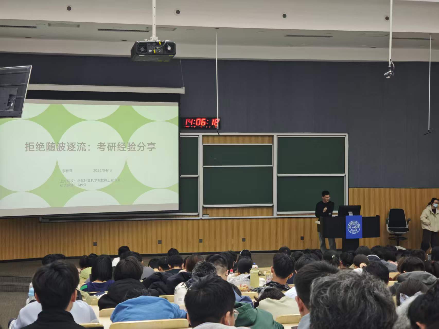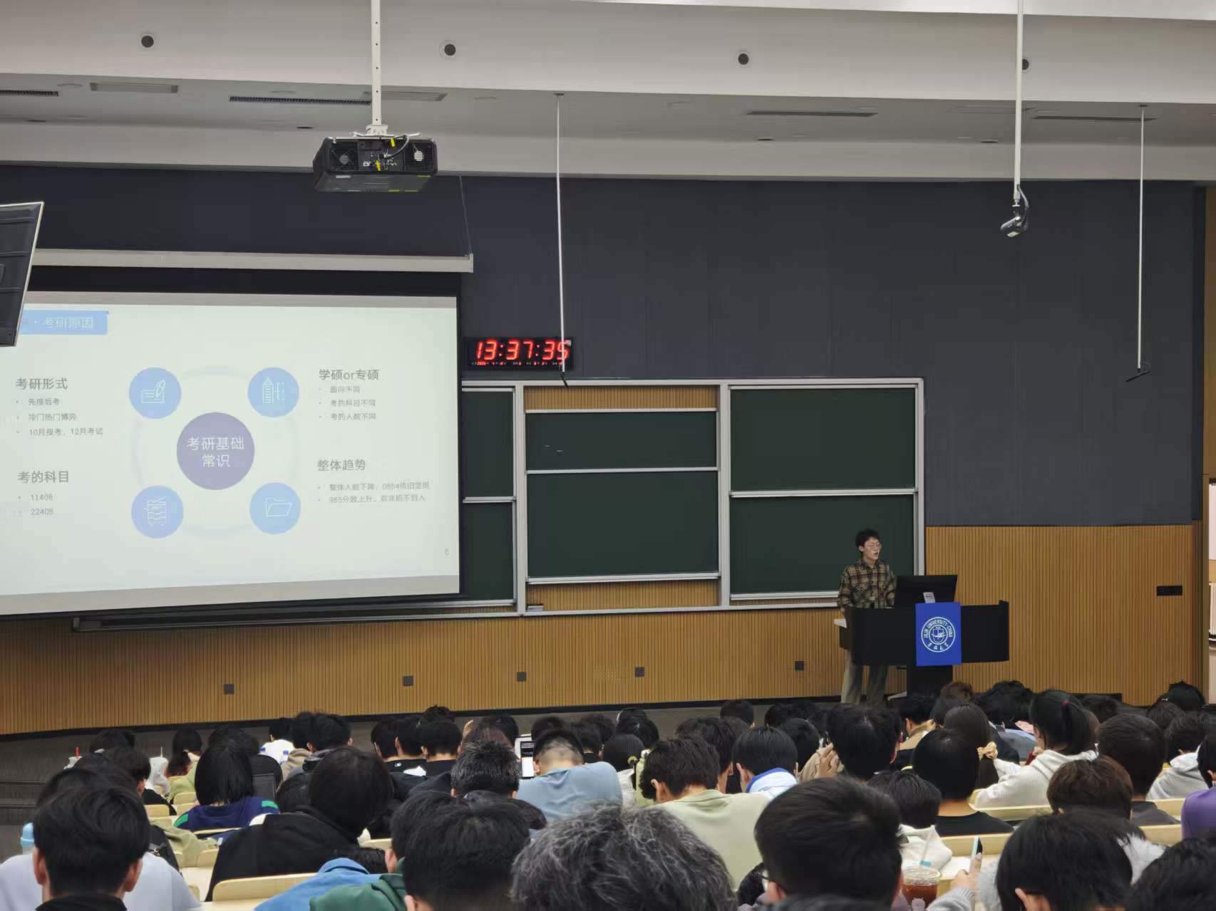 于逸夫教学楼第十阶教室举办国内升学专题分享会。本次活动特邀海天考研高飞老师、2022级学生代表孙帅与李佳泽分享经验,2025级全体本科生到场参与。