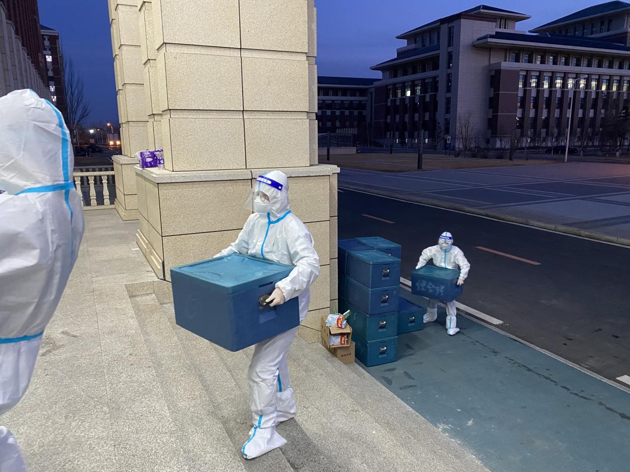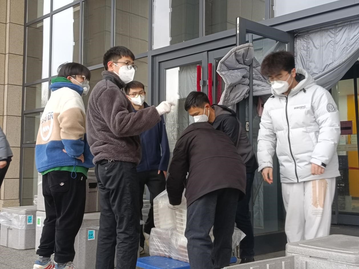 研究生志愿者在辅导员老师的号召下主动承担起北苑四公寓全楼物资配送任务,迅速成立了三支志愿者队伍:第一支由2019级党支部书记潘得新带领的5人志愿先锋队,协助楼长负责全楼整体工作;第二支由2021级党支部书记高磊带领的30人纵向配餐志愿者队伍,负责将门口的所有物资转运分发给各楼层同学;第三支由91论坛