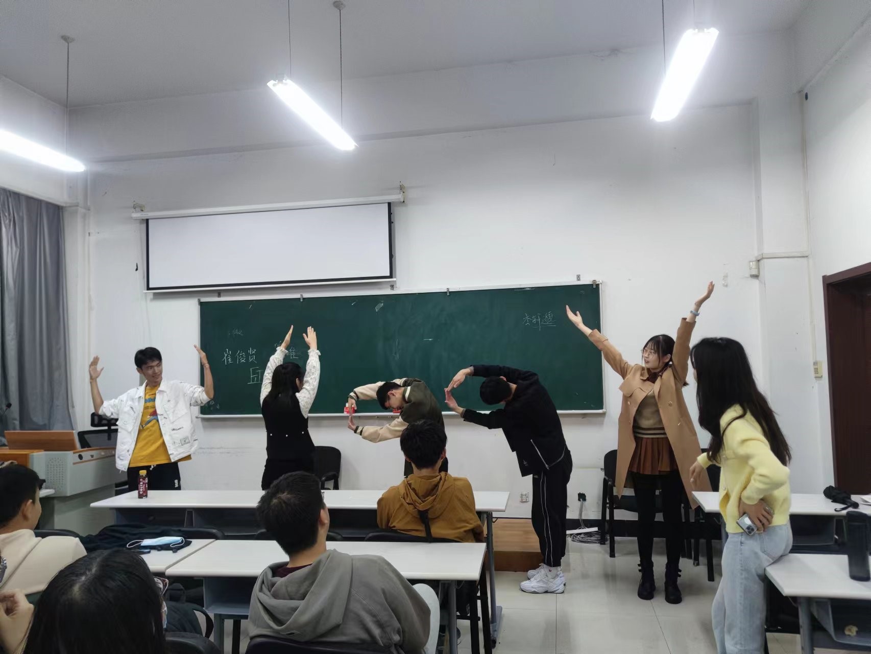 最后是“人体字母”活动,每组3-6名同学,用身体摆出了HAPPYARE等单词,其他组成员轮流猜是什么单词。让同学们提高空间立体感,培养良好的团队合作能力和意识。